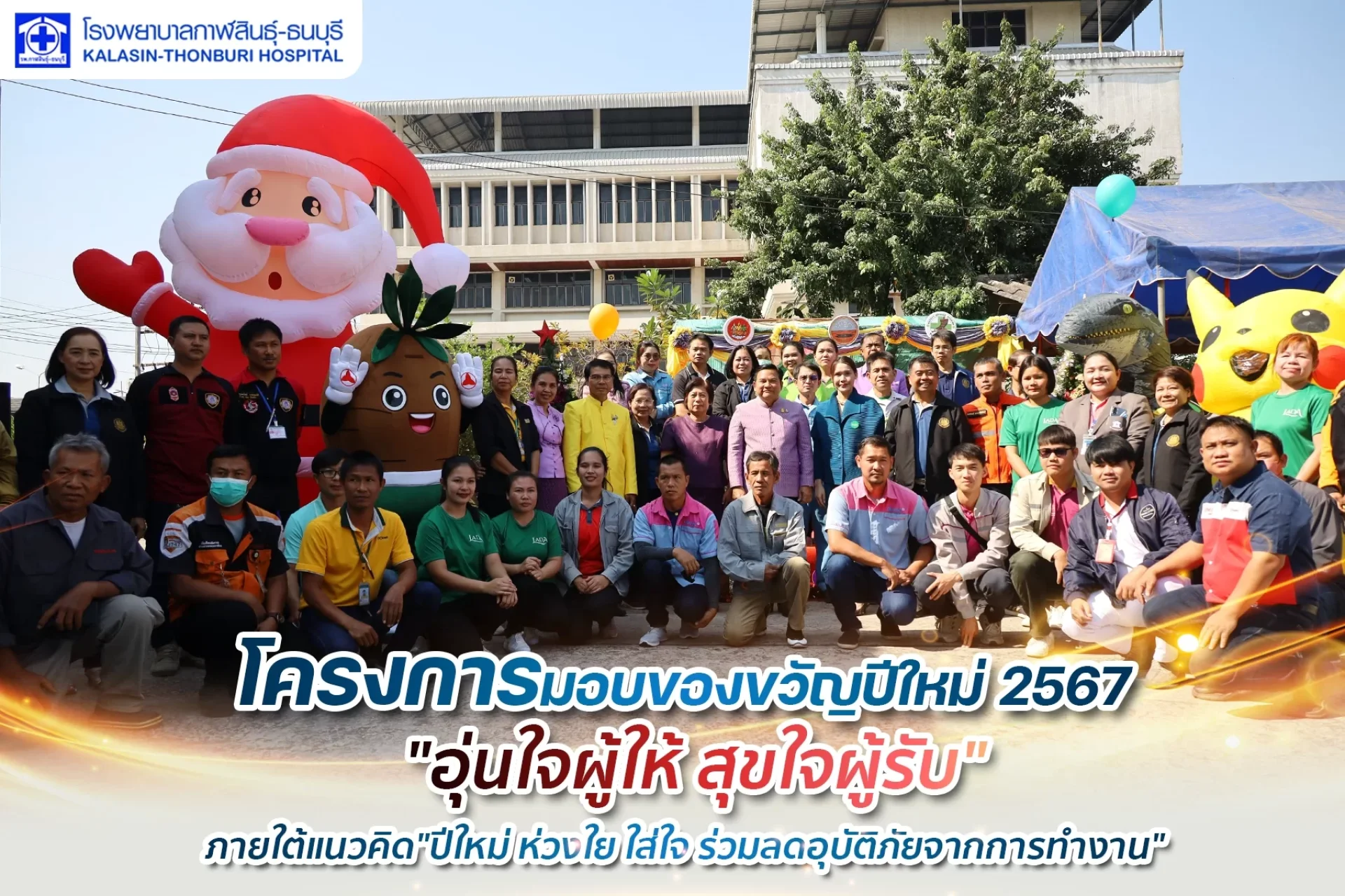วันที่ 15 กุมภาพันธ์ 2567 ตัวแทนจากโรงพยาบาลกาฬสินธุ์-ธนบุรี ได้เข้าร่วมงานเปิดโครงการมอบของขวัญปีใหม่ ๒๕๖๗ "อุ่นใจผู้ให้ สุขใจผู้รับ" ภายใต้แนวคิด"ปีใหม่ ห่วงใย ใส่ใจ ร่วมลดอุบัติภัยจากการทำงาน"