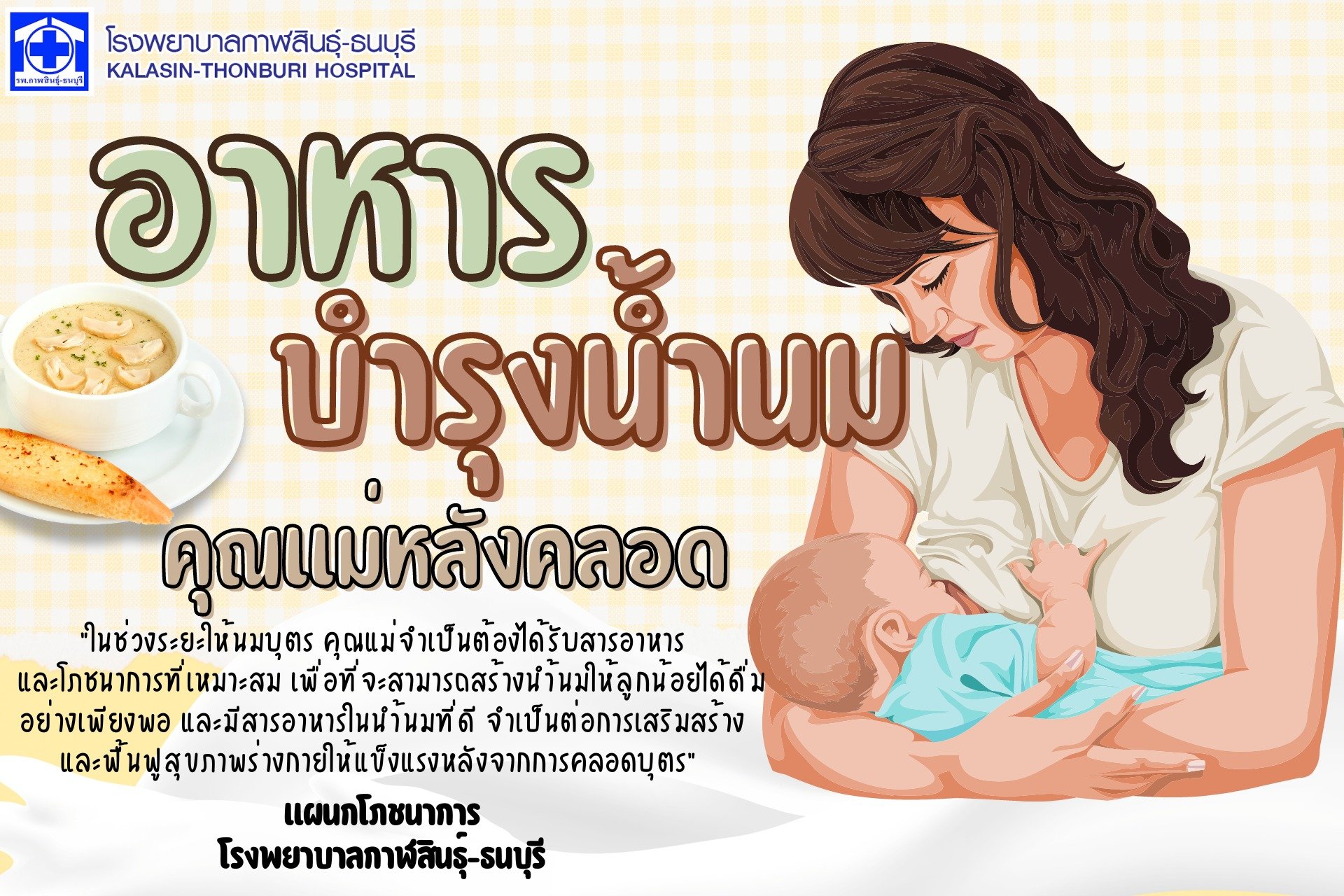 แนะนำเมนูอาหาร บำรุงน้ำนมคุณแม่หลังคลอด คุณแม่จำเป็นต้องได้รับสารอาหารและโภชนาการที่เหมาะสมเพื่อสร้างน้ำนมให้ลูกน้อยได้ดื่มอย่างเพียงพอเพราะ "น้ำนมแม่" เป็นแหล่งของสารอาหารชั้นดี ที่มีความจำเป็นต่อการเสริมสร้างภูมิคุ้มกันให้ลูกน้อย ช่วยการเจริญเติบโต และทำให้ลูกน้อยมีสุขภาพสมบูรณ์แข็งแรง