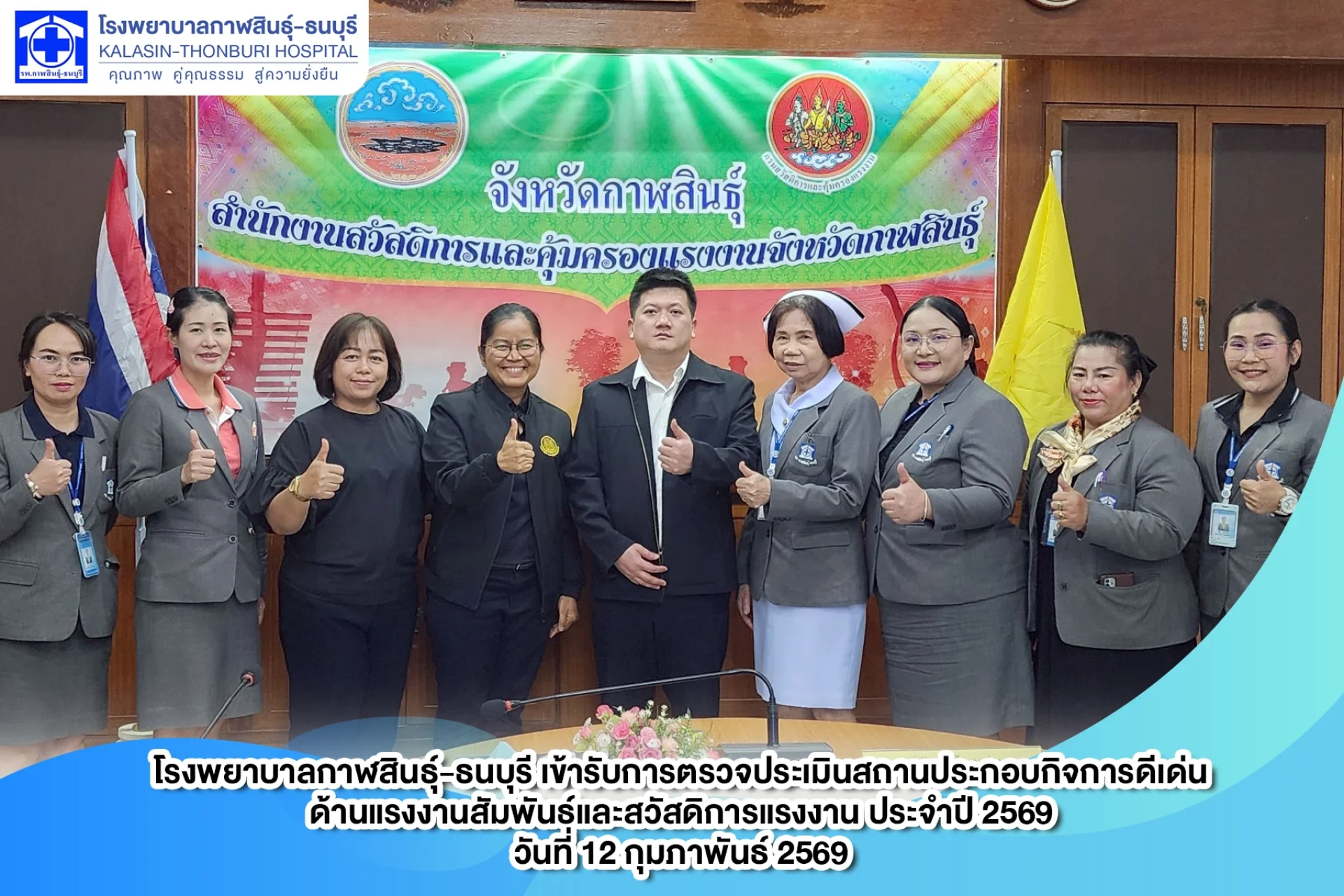 วันที่ 12 กุมภาพันธ์ 2569 โรงพยาบาลกาฬสินธุ์-ธนบุรี เข้ารับการตรวจประเมินสถานประกอบกิจการดีเด่นด้านแรงงานสัมพันธ์และสวัสดิการแรงงาน ภายใต้โครงการของ กรมสวัสดิการและคุ้มครองแรงงาน (กสร.) ซึ่งจัดขึ้นเพื่อยกย่องสถานประกอบกิจการที่มีการบริหารจัดการด้านแรงงานสัมพันธ์ตามระบบทวิภาคีอย่างมีประสิทธิภาพ ได้มาตรฐานตามกฎหมายแรงงาน และมีการดูแลสวัสดิการลูกจ้างอย่างดีเยี่ยม